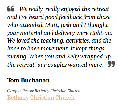 This conference is designed to encourage, strengthen, and equip couples through meaningful teaching, shared meals, and focused time together.